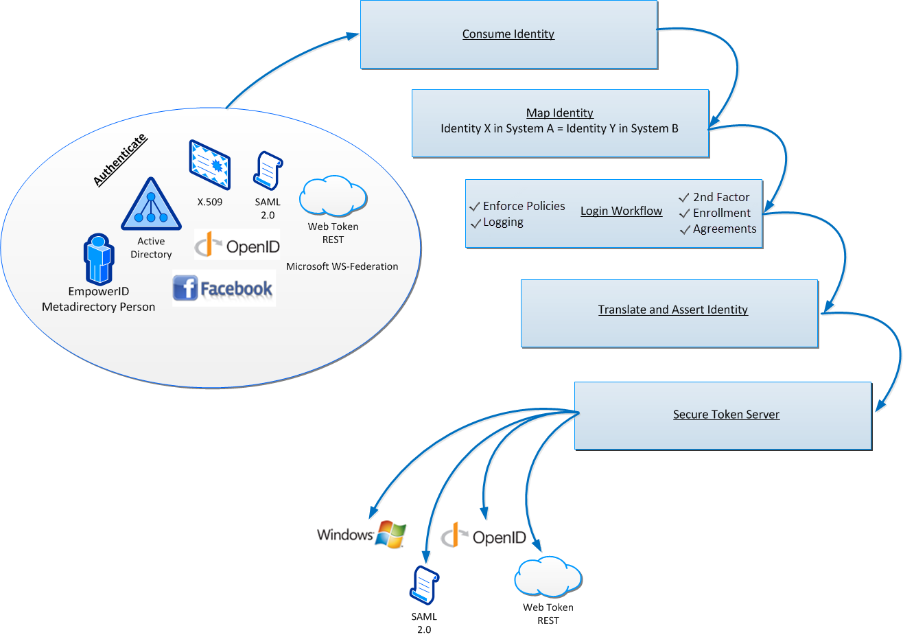 Organizations wishing to federate identities with one another must have mechanisms in place that allow them to trust what each other have to say about user identities. These mechanisms are defined in part by the federated identity standards adopted by each organization. Federated identity standards make it possible for organizations to interchange identity data in a way that allows them to talk intelligently with one another. As an Identity Management Platform, EmpowerID is extremely flexible, supporting all major federated identity standards in use today to include Security Assertion Markup Language (SAML), OpenID, OAuth, WS-Fed, and WS-Trust.