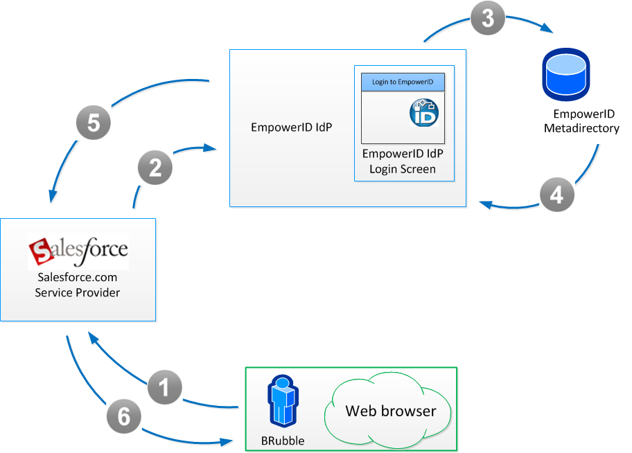 - The EmpowerID IdP redirects BRubble's browser to Salesforce with an assertion of her identity.