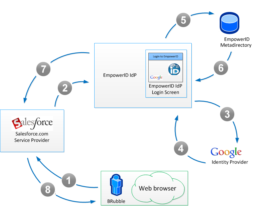 - The EmpowerID IdP generates a federation assertion, signs and encrypts it, and redirects BRubble's browser to Salesforce.