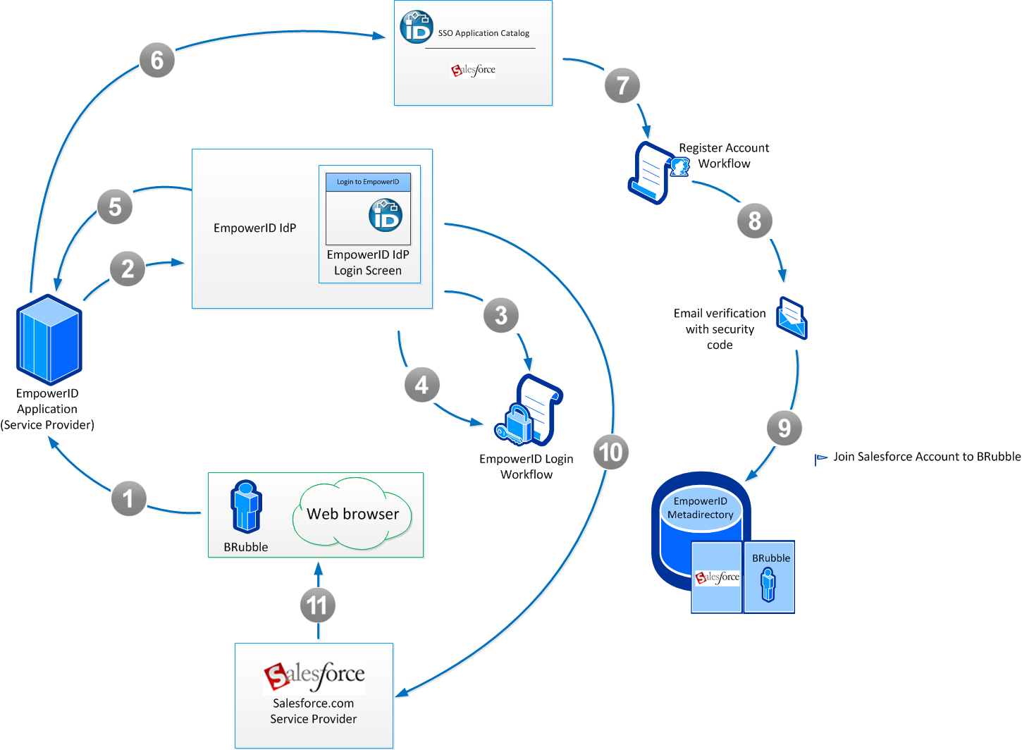 - EmpowerID adds the Salesforce account to the Salesforce account store in EmpowerID and joins the Salesforce account to BRubble's EmpowerID Person object.