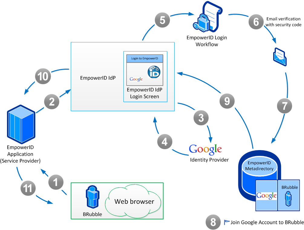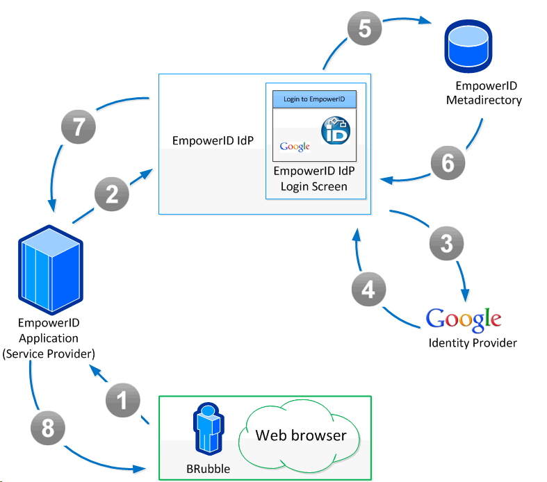 - The EmpowerID Identity Warehouse confirms that the Google account belongs to BRubble and returns the process to the EmpowerID IdP.