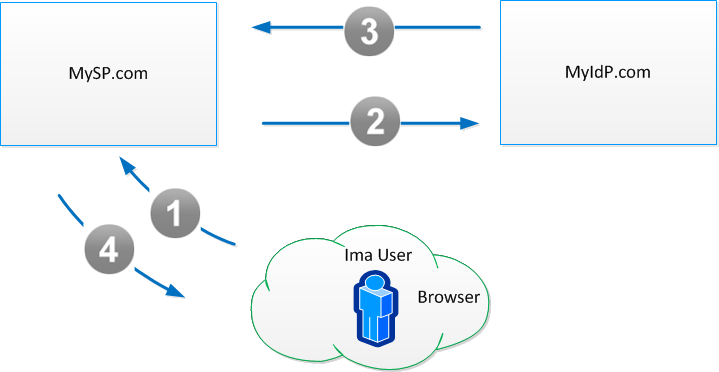 - MySP.com redirects Ima User's browser to MyIdP.com with an authentication request.
