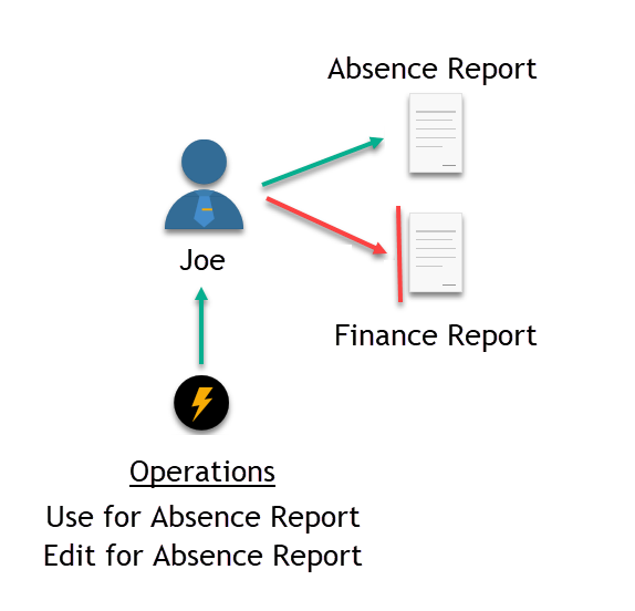 In the image below, there are two protected resource objects on the right side and a user named Joe on the left. Joe has been delegated the "Use" and "Edit" Operations for the Absence Report, allowing him to view and edit the report in EmpowerID (illustrated by the green arrow). However, Joe has not been granted any Operations for the Finance Report, so he cannot access the report in any way (represented by the red arrow). He cannot even see that a Finance Report exists in EmpowerID.