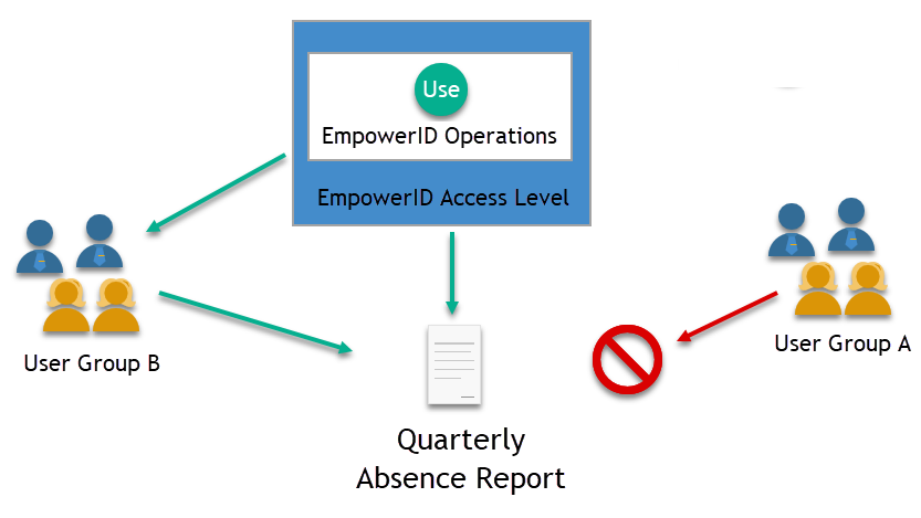 Example: Consider a Quarterly Absence Report, a group of users, and an Access Level for the report. The Access Level includes a single EmpowerID Operation: the Use operation. This operation, when executed against the report, enables it to be viewed in EmpowerID. User Group B can view the report because it has been assigned an Access Level containing the Use operation. However, User Group A lacks this Access Level, so they cannot view the report.