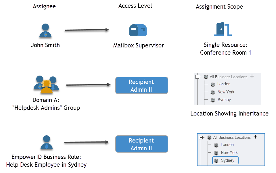 The following image illustrates Access Level assignments granted to three different assignees with different scopes. John Smith has a direct assignment for one mailbox. Members of the Helpdesk Admins Group have an assignment for all mailboxes in the Offices OU and below. All people assigned to the Helpdesk in the Sydney Business Role can access mailboxes in the Sydney location only.