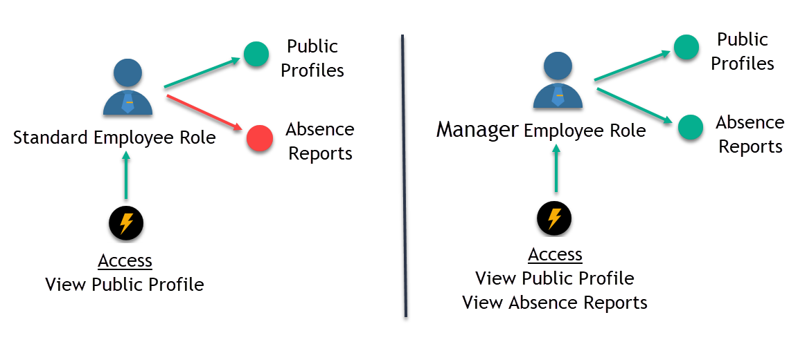 The following illustration demonstrates this distinction. Both the Standard Employee and Manager roles can view public profile information (represented by the green arrow). However, the Manager role has additional access to view absence reports (indicated by the green arrow), while the Standard Employee is restricted from this capability (signified by the red arrow).