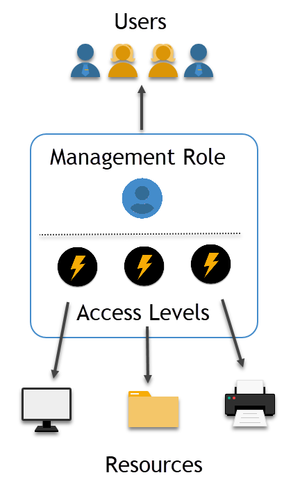 The following image illustrates the relationship between resources, Management Roles, Access Levels, and users. The Management Role connects users and resources via the Access Levels contained within the role.