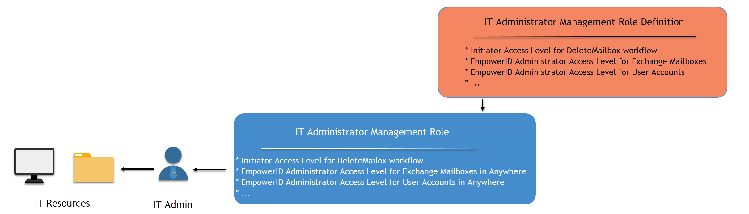 Example: The IT Administrator Management Role Definition includes 345 Access Levels granting access to general pages, workflows, and other resources that IT Administrators might need. The Enterprise IT Administrator Management Role inherits these 345 Access Levels and contains eight additional Access Levels scoped at the "Anywhere" location, providing enterprise-wide capabilities.