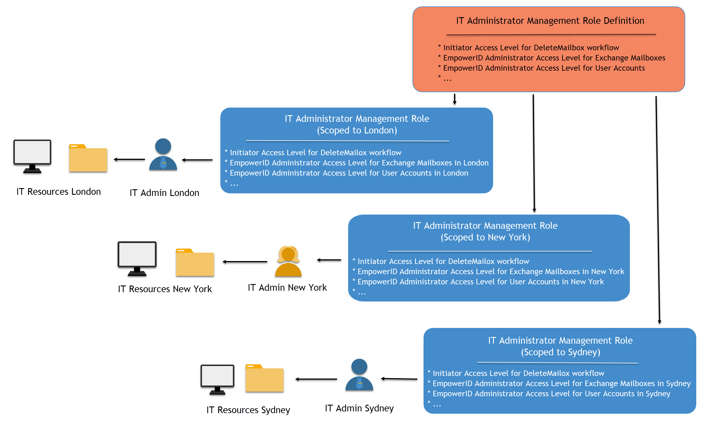 Management Role Definitions can have multiple child Management Roles, allowing for the creation of regional roles for every region within an enterprise. For instance, if you have organizational locations in "London," "New York," and "Sydney," you could create a London IT Administrator Management Role, a New York IT Administrator Management Role, and a Sydney IT Administrator Management Role from the single IT Administrator Management Role Definition.