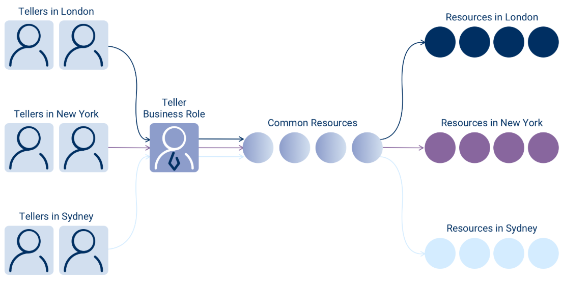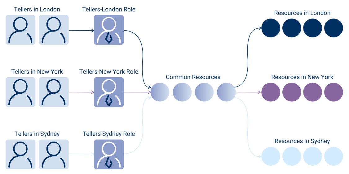However, if the banking institution has branches in numerous cities (e.g., New York, London, and Sydney), complications arise. Each teller requires access to a shared pool of resources due to their job, but they also need resources unique to their location. Tellers in New York would require access to New York-specific resources but not those in London or Sydney, and vice versa.
