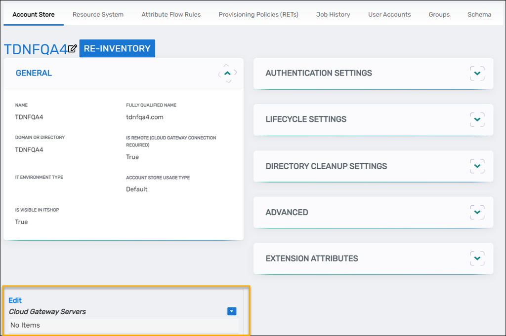 This directs you to the Account Store Details page for the account store, where you should see a Cloud Gateway Servers pane. If you do not see this pane, this means the Is Remote (Cloud Gateway Connection Required) setting was not enabled for the account store.