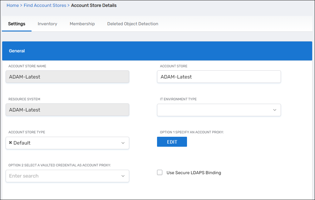 This opens the edit page for the account store. This page allows you to specify the account proxy used to connect EmpowerID to your AD LDS instance as well as how you want EmpowerID to handle the user information it discovers in AD LDS during inventory. Settings that can be edited are described in the table below the image.