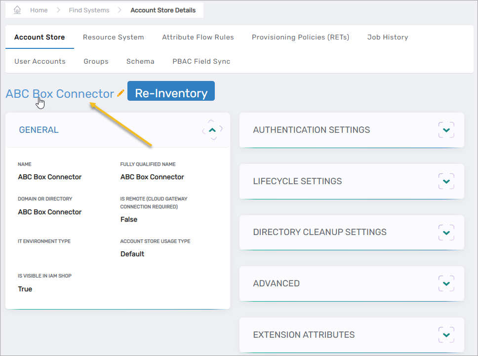 On the Account Store and Resource System page, select the Account Store tab and then click the pencil icon to put the account store in edit mode.