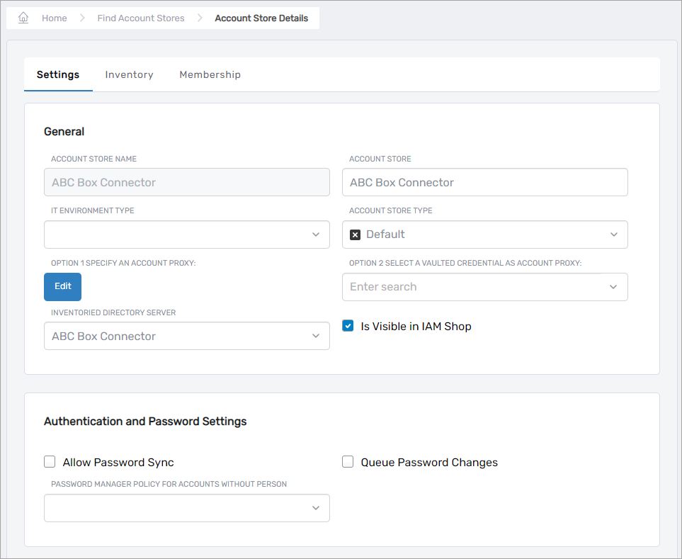 Account Store Settings Setting Description General Settings IT Environment Type Allows you to specify the type of environment in which you are creating the account store. Account Store Type Allows you to specify the type of account store you are creating. Option 1 Specify an Account Proxy Allows you to change the credentials for the account that EmpowerID uses to connect to and manage the account store. Option 2 Select a Vaulted Credential as Account Proxy Allows you to use a credential that you have vaulted in EmpowerID as the account that EmpowerID uses to connect to and manage the account store. Inventoried Directory Server Allows you to select a connected server as the directory server for the account store. Is Remote (Cloud Gateway Connection Required) This setting appears for account stores with local directories, such as Active Directory, LDAP, SAP, etc. When enabled, this tells EmpowerID to use the Cloud Gateway Connection for that account store. The Cloud Gateway Connection must be installed on an on-premise machine. For installation information, please see Installing the EmpowerID Cloud Gateway Client. Is Visible in IAM Shop Specifies whether the account store can be used to filter objects relative to the account store, such as groups, to users searching for resources in the IAM Shop. Authentication and Password Settings Allow Password Sync Enables or disables the synchronization of password changes to user accounts in the domain based on password changes for the owning person object or another account owned by the person. This setting does not prevent password changes by users running the reset user account password workflows. Queue Password Changes Specifies whether EmpowerID sends password changes to the Account Password Reset Inbox for batch processing. Password Manager Policy for Accounts without Person Specifies the Password Manager Policy to be used for user accounts not joined to an EmpowerID Person. Provisioning Settings Allow Person Provisioning (Joiner Source) Specifies whether EmpowerID Persons can be provisioned from user accounts in the account store. Allow Attribute Flow Specifies whether attribute changes should flow between EmpowerID and the account store. Allow Provisioning (By RET) Allows or disallows the Resource Entitlement (RET) Inbox process to auto-provision accounts for this domain for users who receive RET policy-assigned user accounts, but have not yet had them provisioned. Allow Deprovisioning (By RET) Allows or disallows the Resource Entitlement Inbox process to auto de-provision accounts for this domain for users who still have RET policy-assigned user accounts, but no longer receive a policy that grants them a user account in the domain. De-provisioning only occurs if the de-provision action on the Resource Entitlement policy is set to De-Provision. Max Accounts per Person This specifies the maximum number of user accounts from this domain that an EmpowerID Person can have linked to them. This prevents the possibility of a runaway error caused by a wrongly configured Join rule. It is recommended that this value be set to 1 unless users will have more than 1 account and you wish them to be joined to the same person. Business Role Settings Allow Business Role and Location Re-Evaluation Specifies whether Business Role and Location re-evaluation should occur for the account store Business Role and Location Re-Evaluation Order Specifies the order of the account store for re-evaluating Business Roles and locations Inventory Auto Provision OUs as IT System Locations Specifies whether EmpowerID should automatically provision external OUs as IT System locations Inventory Auto Provision External Roles as Business Roles Specifies whether EmpowerID should provision Business roles for external account store roles Default Person Business Role Specifies the default EmpowerID Business Role to be assigned to each EmpowerID Person provisioned from the user accounts in the account store. Default Person Location (leave blank to use account container) Specifies the default EmpowerID Location to be assigned to each EmpowerID Person provisioned from the user accounts in the account store. Group Settings Allow Account Creation on Membership Request Specifies whether EmpowerID creates user accounts in the account store when an EmpowerID Person without one requests membership within a group belonging to the account store. Recertify External Group Changes as Detected Specifies whether detected group changes should trigger recertification. SetGroup of Groups to Monitor for Real-Time Recertification Specifies the SetGroup or Query-Based Collection with groups that need to be recertified when changes to the membership of one or more of those groups occurs. The setting must be set to the GUID of the target SetGroup. If the GUID for a specific SetGroup is not set and Recertify External Group Changes as Detected is enabled for the account store, EmpowerID processes all security group memberships for recertification.