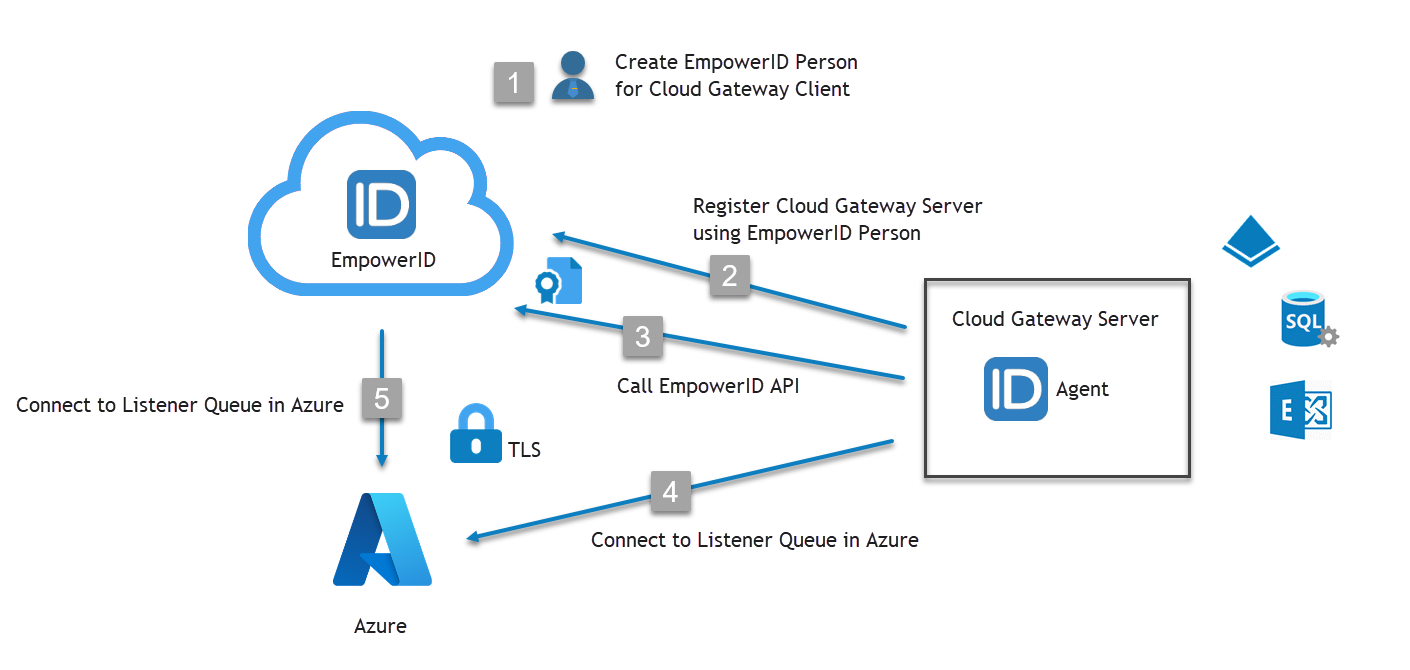 • Step 5 – EmpowerID connects to the Azure queue using the same connection information sent to the Cloud Gateway Client, constituting a point-to-point connection between EmpowerID in the cloud and the on-premise Cloud Gateway Client. All such communications are secured via TLS.