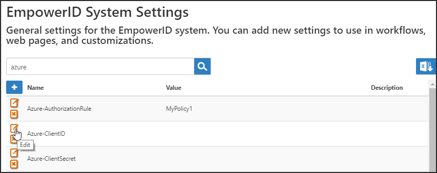 2. Search for "Azure," locate the Azure-ClientID setting and click the Edit button.