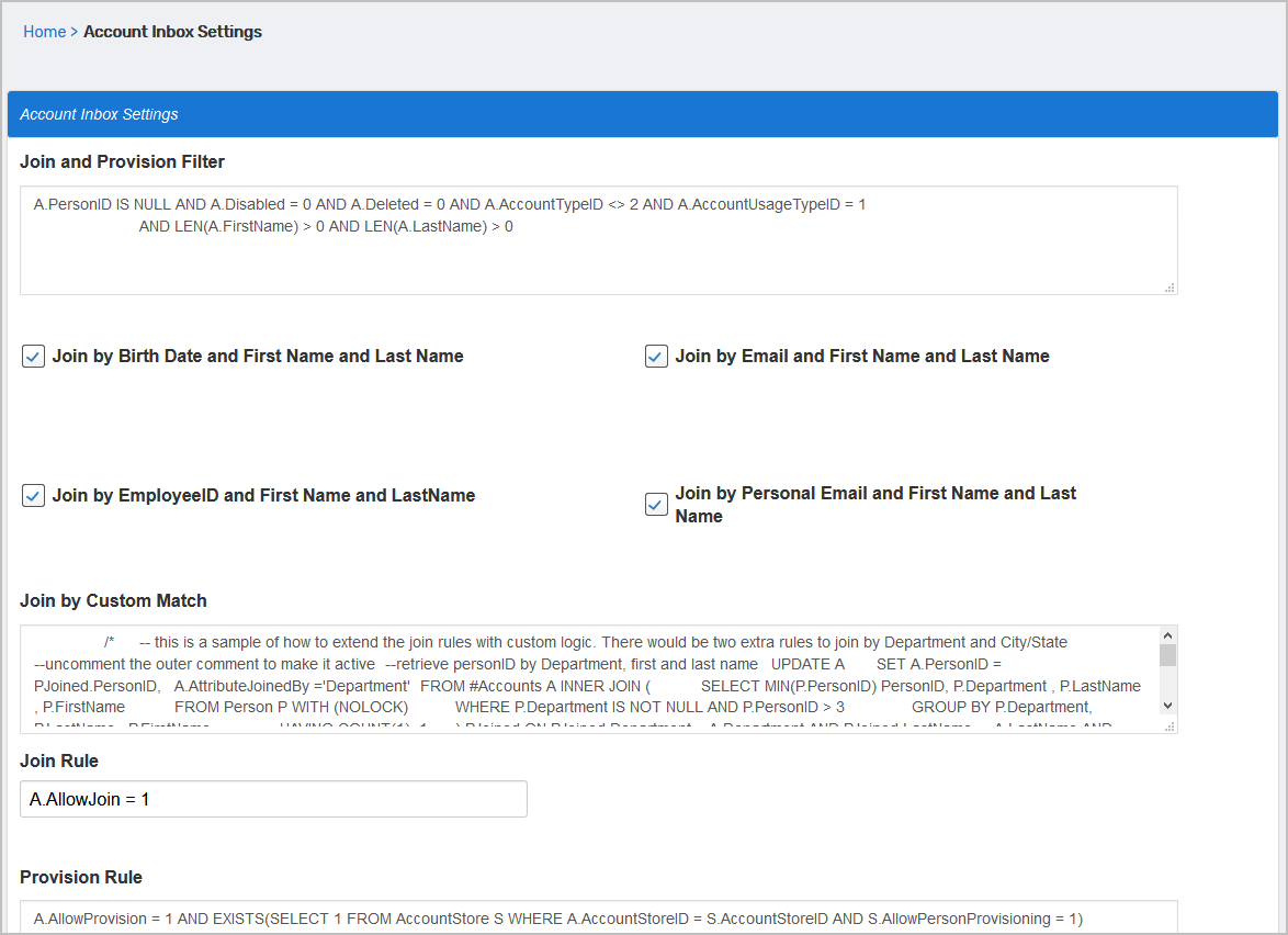 Account Inbox SettingsAccount Inbox Settings Setting Description Join and Provision Filter This setting is used to set the filtering logic for joining and provisioning people from accounts inventoried in an external, connected user directory. The default shipping logic ensures that for joining or provisioning, an inventoried account must meet the following criteria: