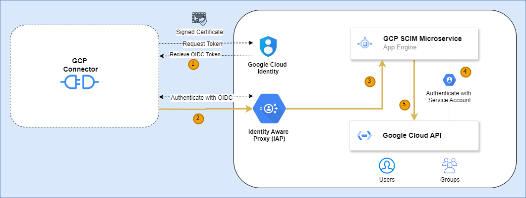 - Once authenticated, the GCP Connector is granted access to the SCIM Microservice, which is protected by IAP.