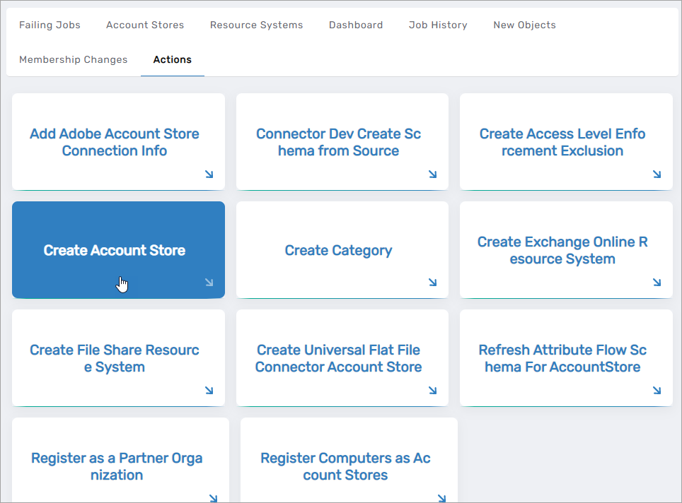 On the Account Stores page, select the Actions tab and click Create Account Store.