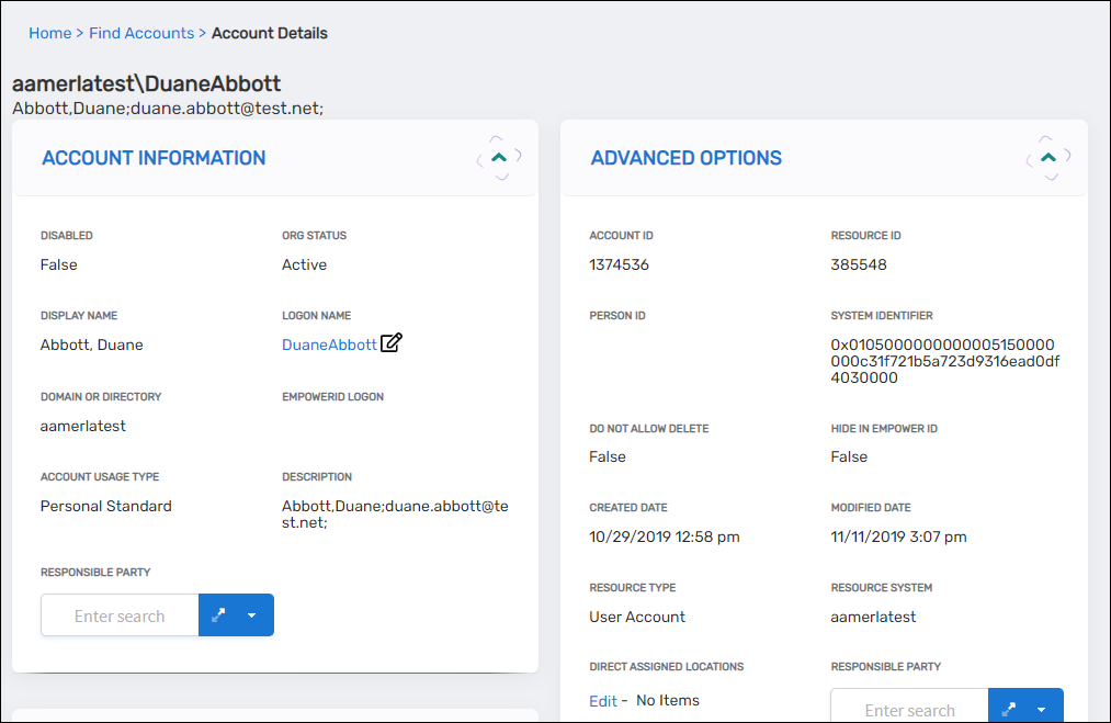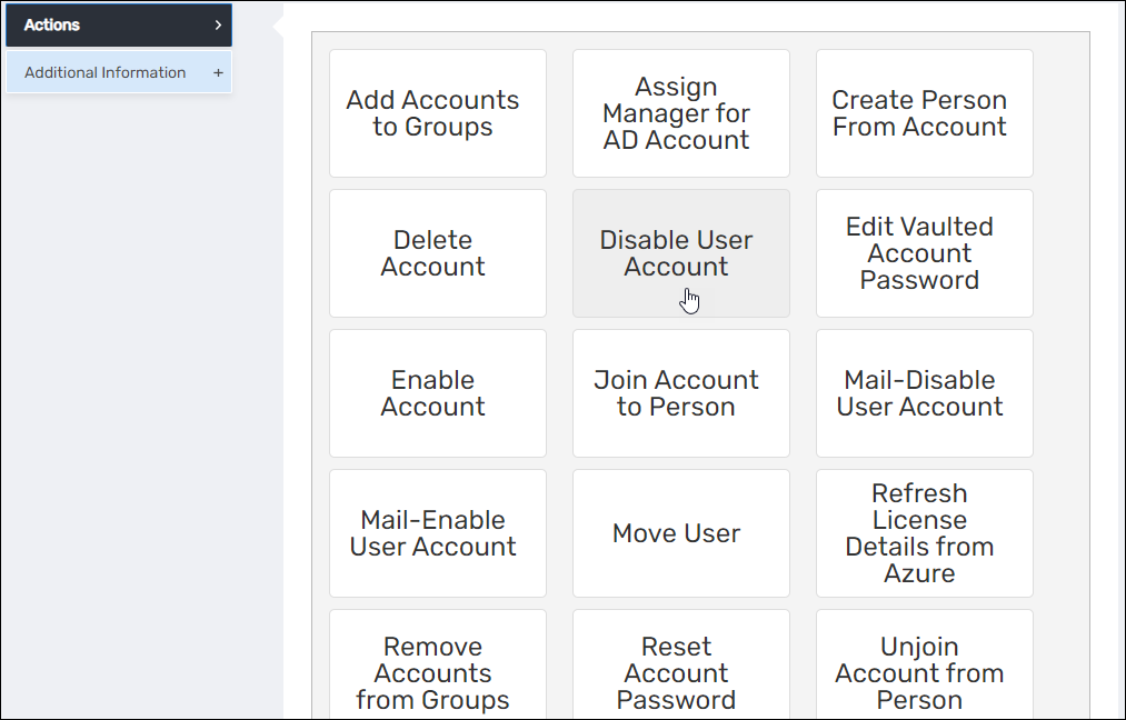 To perform an action in EmpowerID, simply click on the corresponding tile or button. For instance, if you need to edit one or more attributes, click the Edit button. To create an EmpowerID Person from an account, select the Create Person From Account button. If you wish to disable an account, click on the Disable User Account button, and so forth. Each action can be executed by clicking its respective button