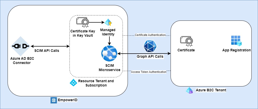 Certificate: EmpowerID's EntraID B2C connector uses a secure handshake to communicate via Azure Certificate Authentication with the EmpowerID SCIM Microservice. This ensures that the microservice fulfills requests only from authorized EntraID B2C clients.