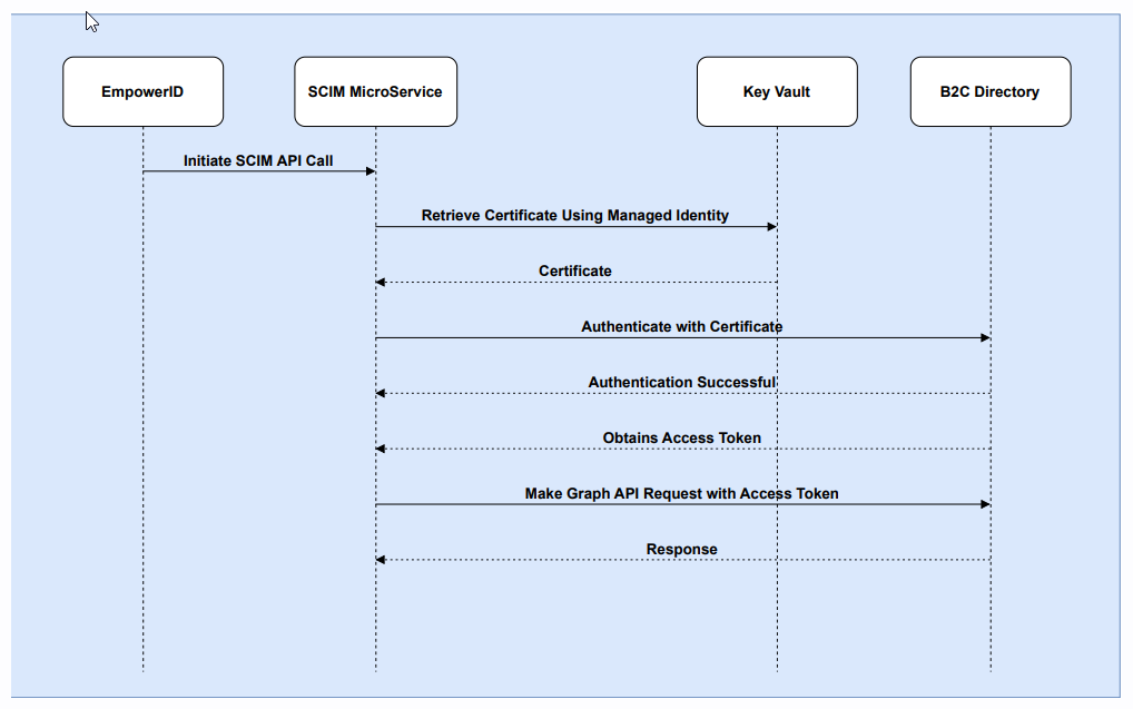 - Authentication: Using the retrieved certificate and a preconfigured ClientID, the SCIM microservice authenticates itself with the Azure B2C directory, ensuring the microservice's identity is valid.