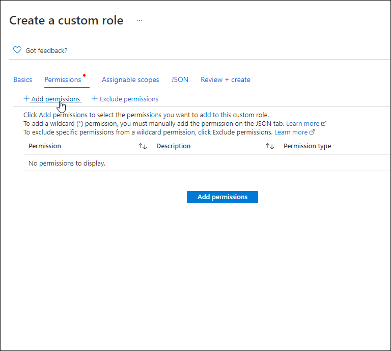 The permissions listed in the following tables represent traditional application-level permissions, but each can be replaced with an appropriate custom role definition when implementing the least-privilege approach.
