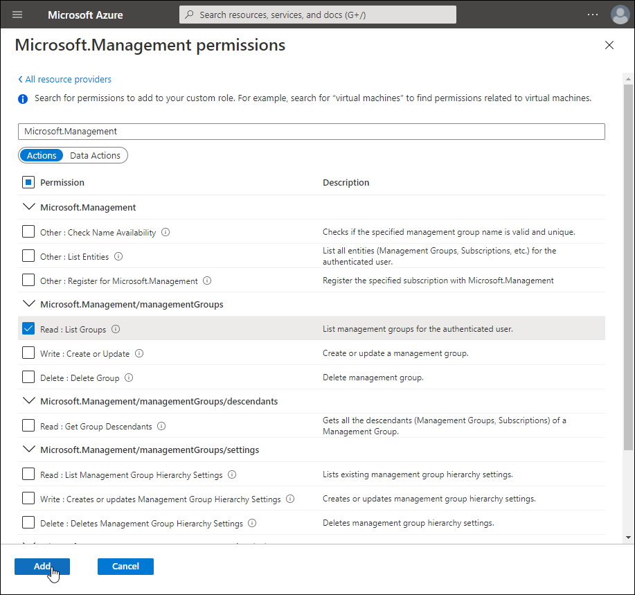 | Get Management Groups | Microsoft.Management/managementGroups/read |