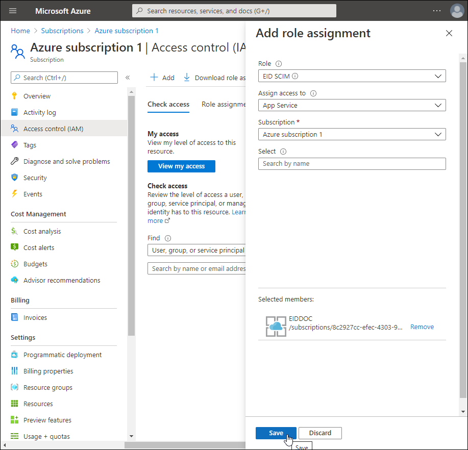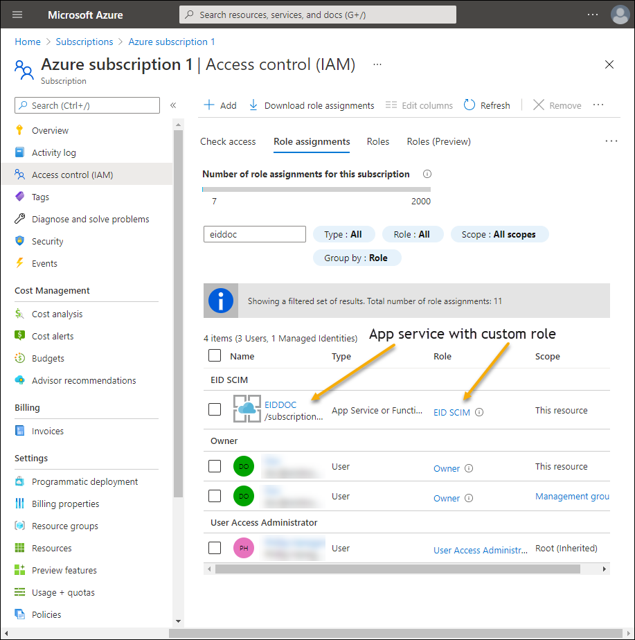 The EntraID SCIM microservice requires specific permissions to interact with Microsoft Graph API and Azure resources. You can implement permissions using two approaches: tenant-wide application permissions for simplicity, or custom Azure roles with least privilege for enhanced security. Choose the approach that best aligns with your organization's security policies and compliance requirements.