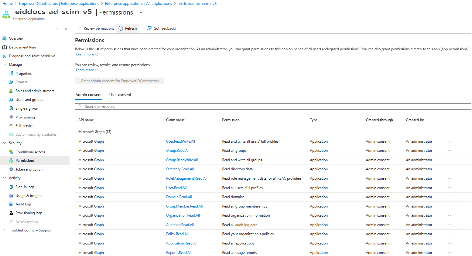This appendix provides a comprehensive list of Microsoft Graph API Application Permissions required for each endpoint used in the EntraID SCIM Connector. These permissions represent the traditional tenant-wide approach, which grants broad access across all resources in your Azure tenant.