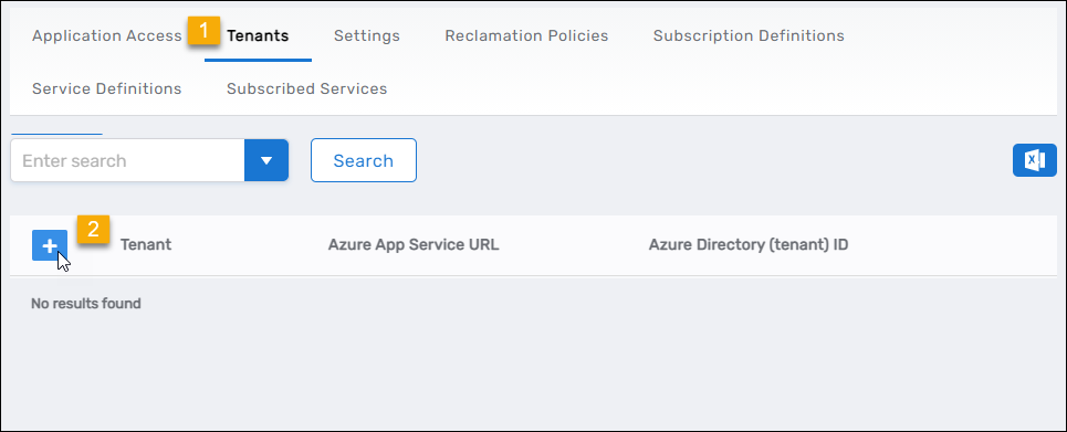 - Select the Tenants tab and click the Add button on the Tenant grid header.