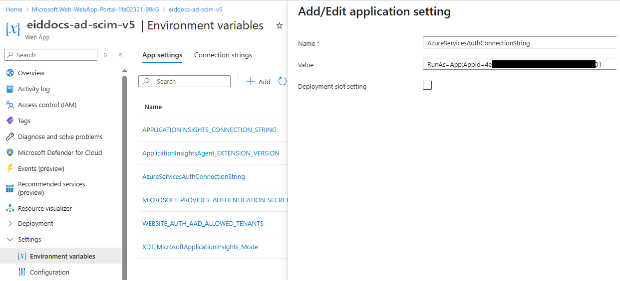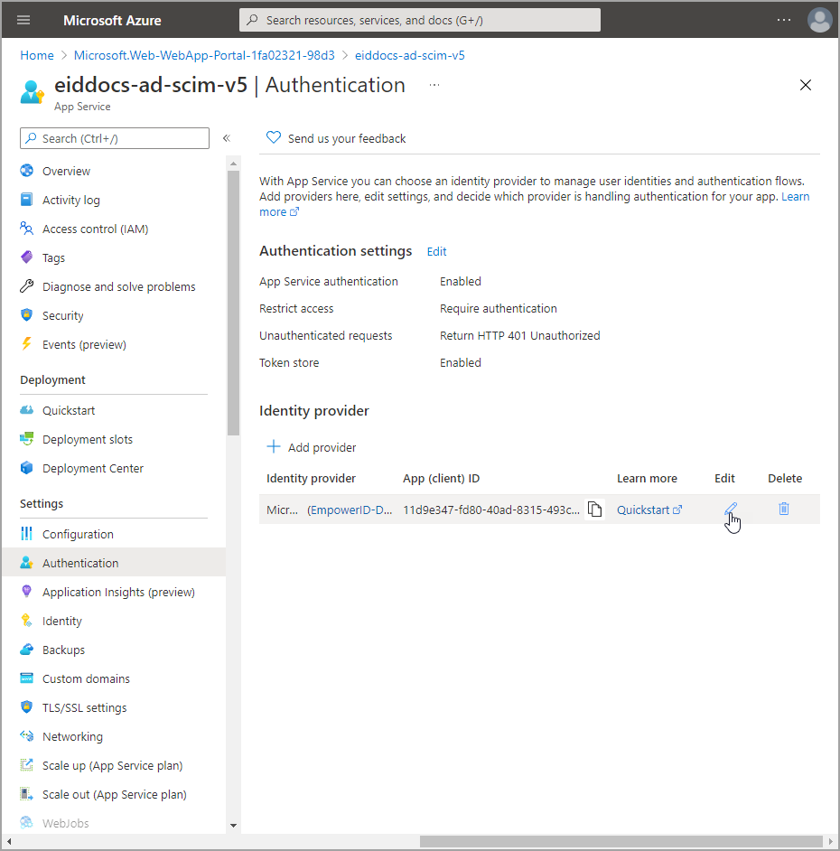 EmpowerID uses the EntraID SCIM Microservice to make API calls to your Azure tenant in response to your actions in EmpowerID. As part of the deployment process for the microservice, an app service needs to be created to host the microservice and configured for EntraID authentication, as well as with a managed identity that can be granted permissions to access resources protected by EntraID.