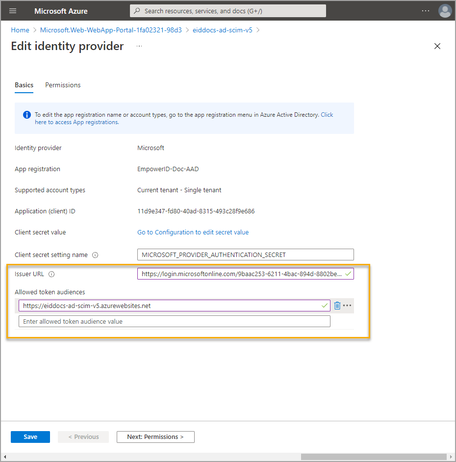 https://login.microsoftonline.com/<Your Tenant ID>. - Under Allowed token audiences enter the URL for the app service.