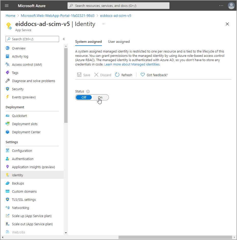 - Under the System assigned tab, turn on the Status toggle to create the managed identity.