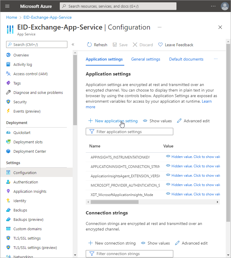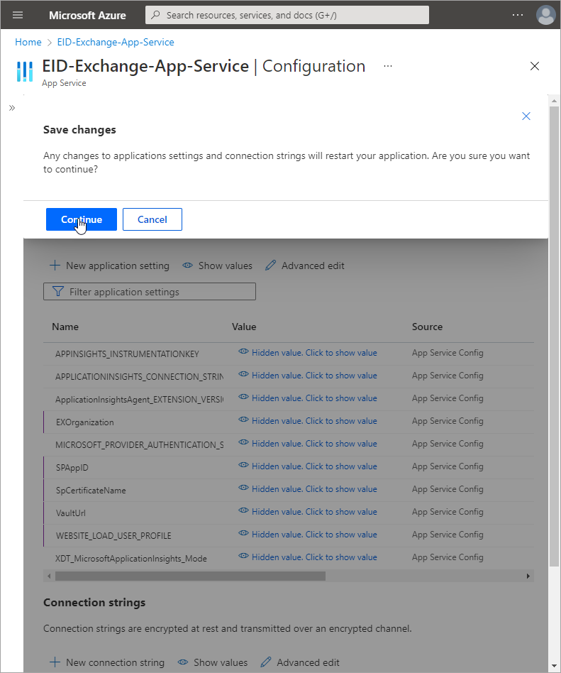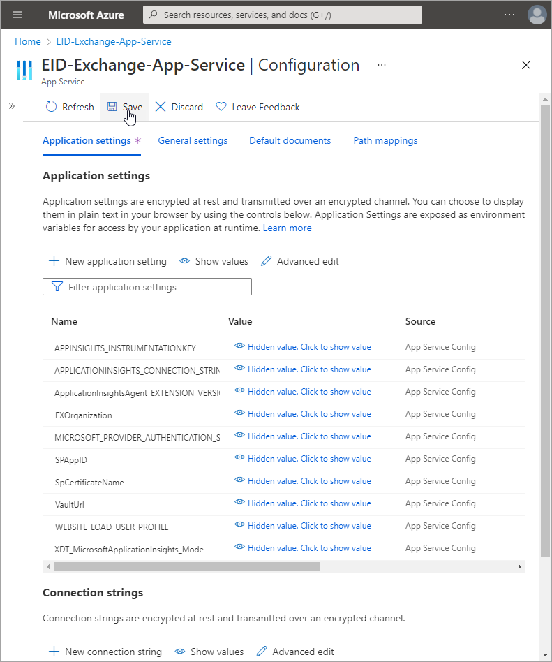 As a final prerequisite step, apply the configuration settings listed in the table below to the Exchange Online app service.