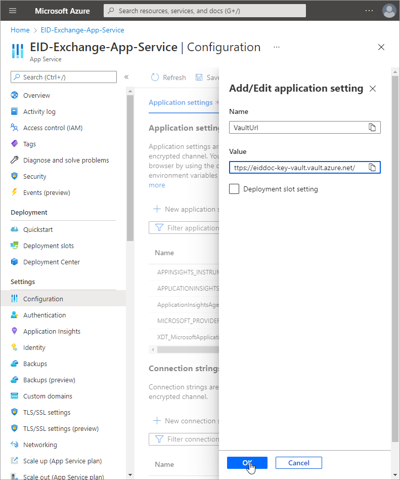 - Value – Enter the URL to the Azure key vault where the private key certificate resides.