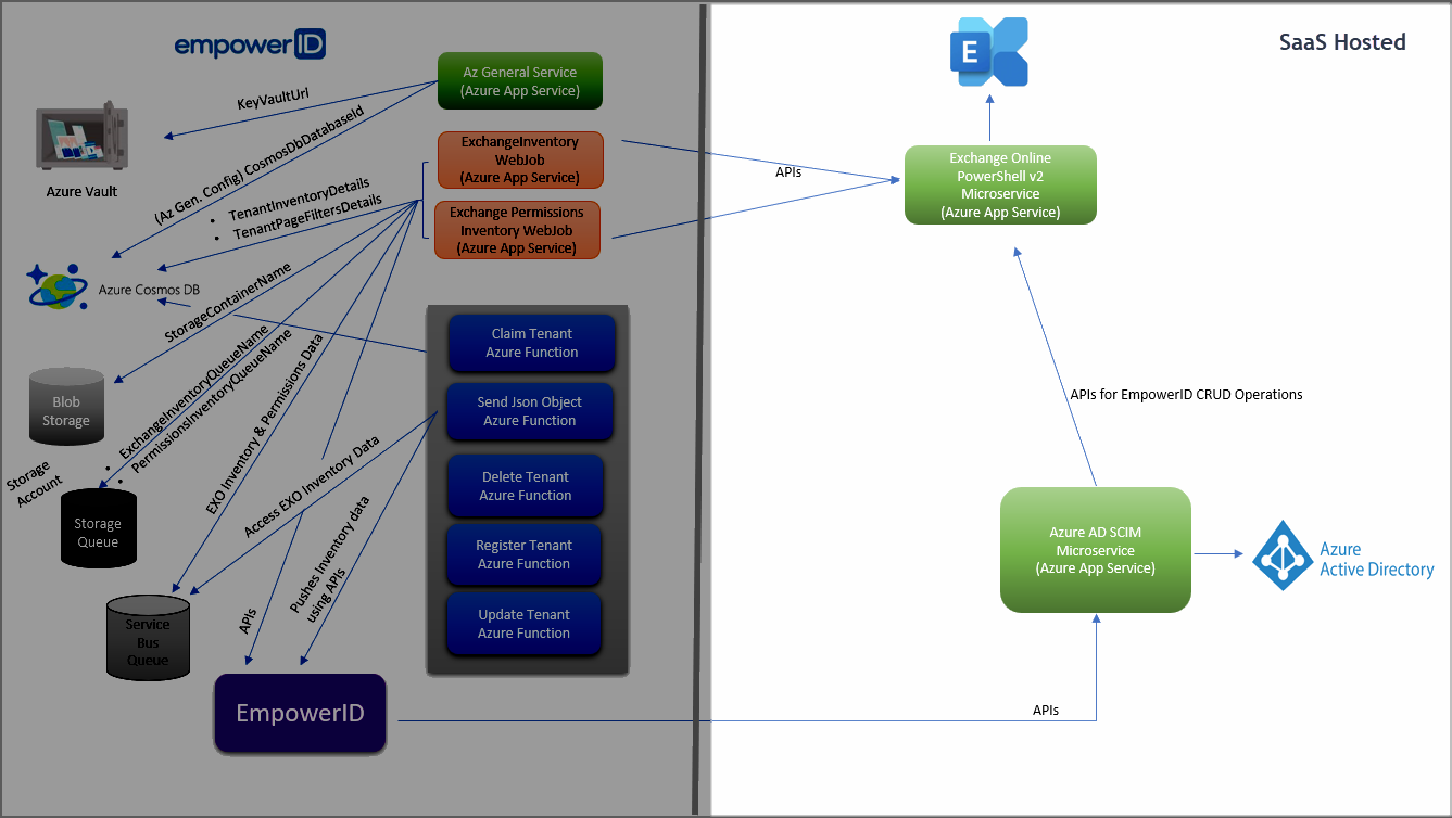 If you are taking advantage of EmpowerID SaaS, the components you need to configure in Azure are minimal as EmpowerID configures everything needed to inventory Exchange (represented by the grayed-out components on the left side of Figure 2 below). As a SaaS customer, you only need to configure the components shown on the right side of the figure. If you are using EmpowerID to manage more than one Exchange tenant, you need to configure these components for each of those tenants.