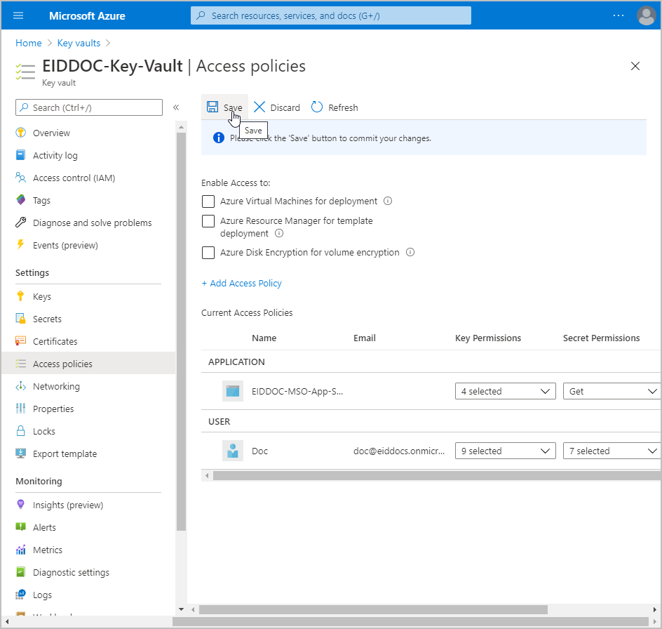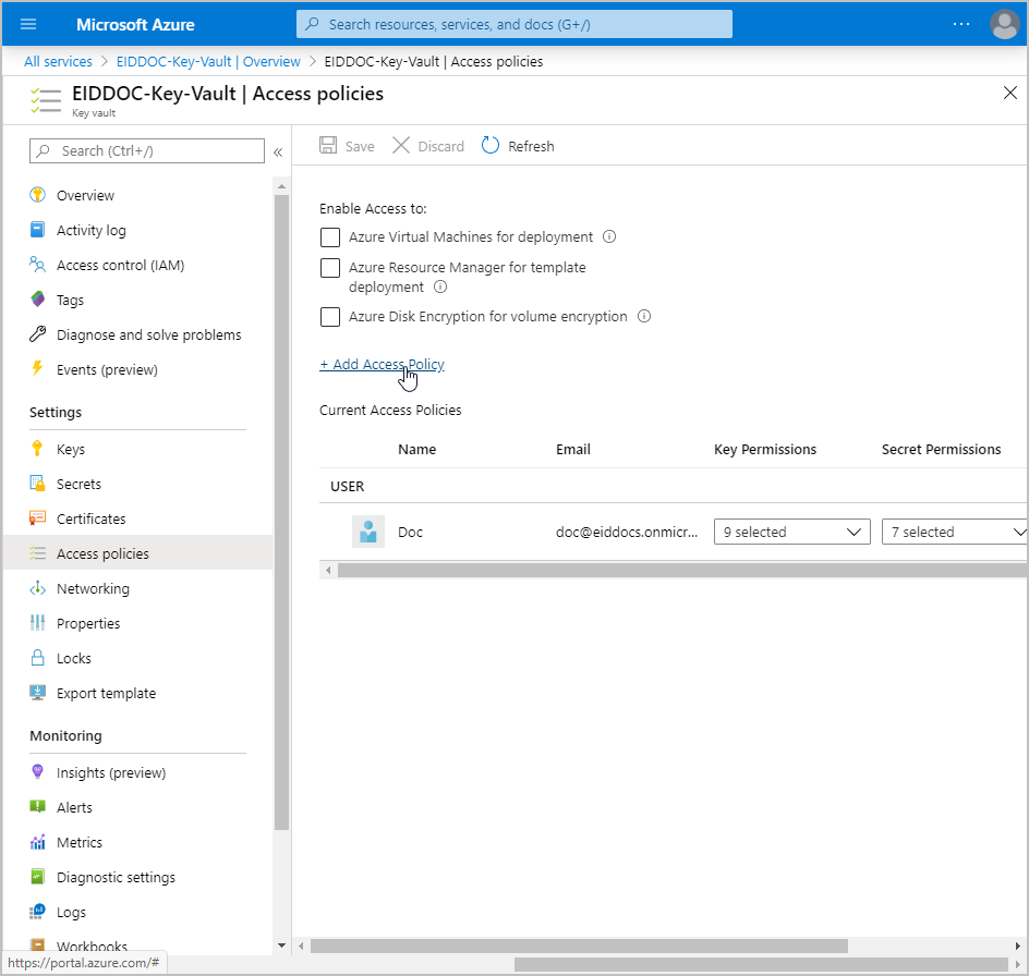 On the navbar for the Key Vault, under Settings, click Access Policies.