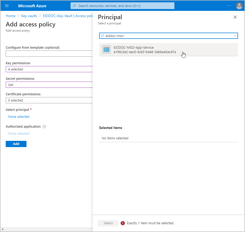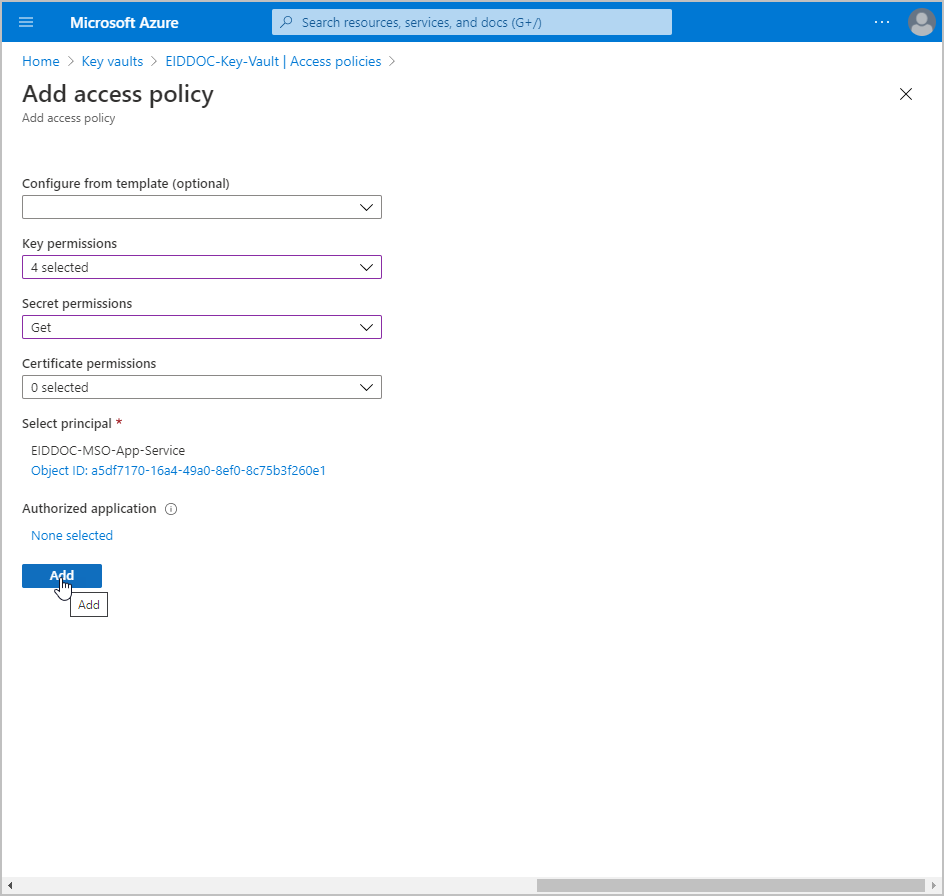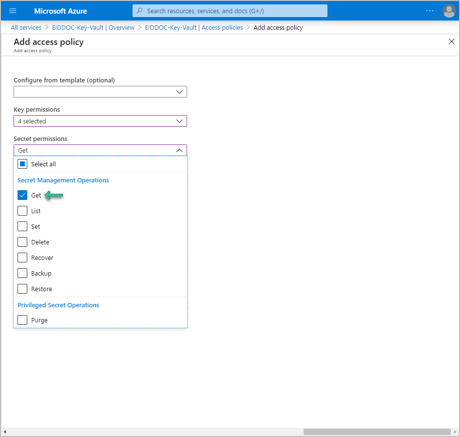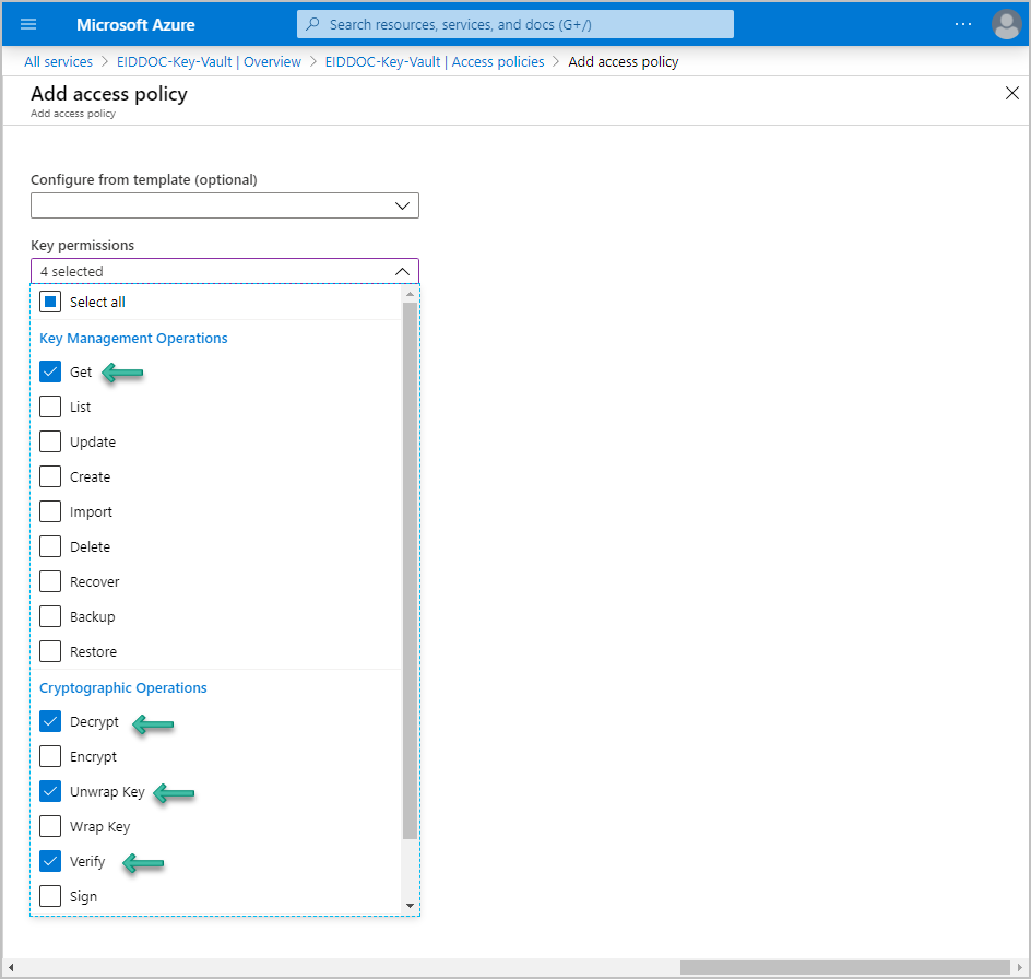 Click the Key Permissions drop-down and select the Get, Decrypt, Unwrap Key, and Verify operations.