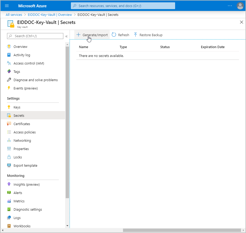 On the navbar for the Key Vault, under Settings, click Secrets.