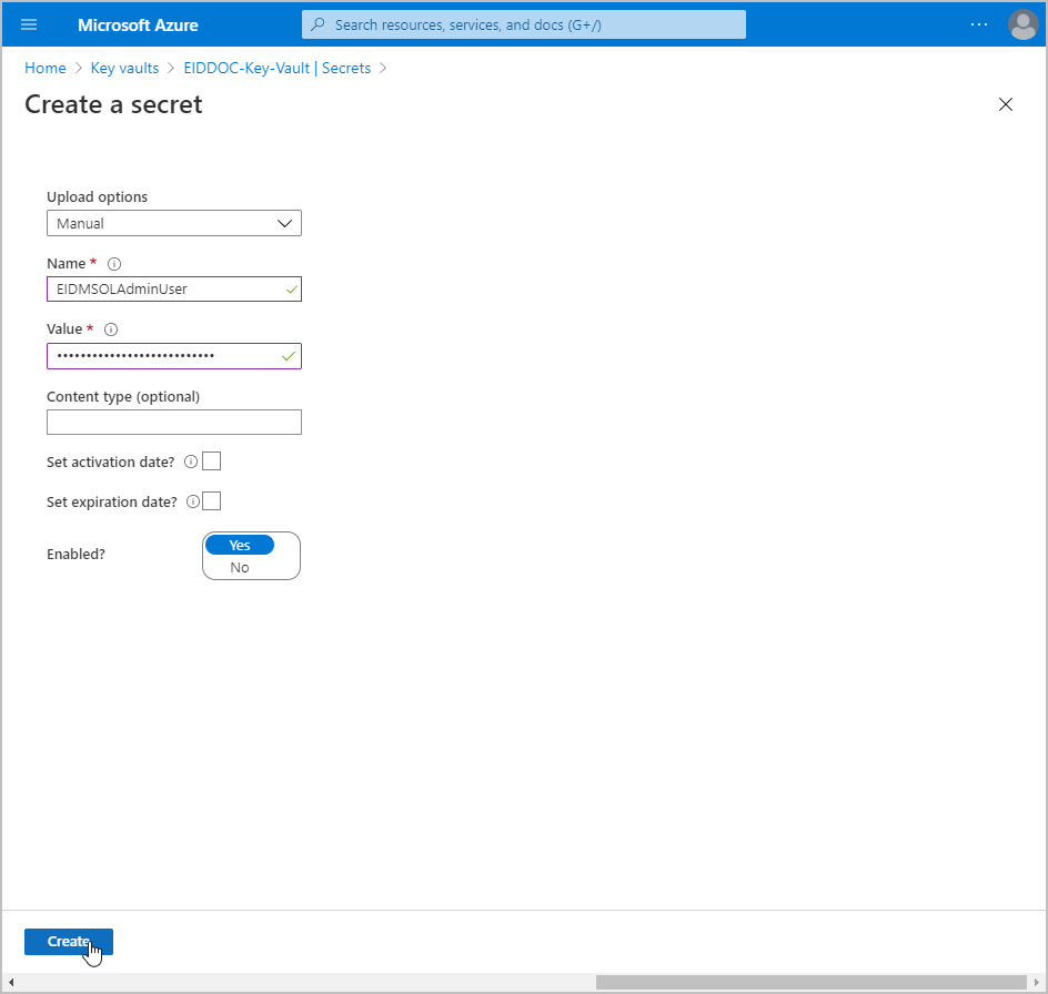 - Name – Enter EIDMSOLUserPassword. -Value – Enter a password for the secret.