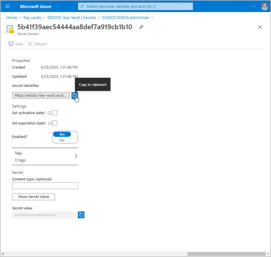 On the Properties blade, copy the Secret Identifier. You will use this value later.