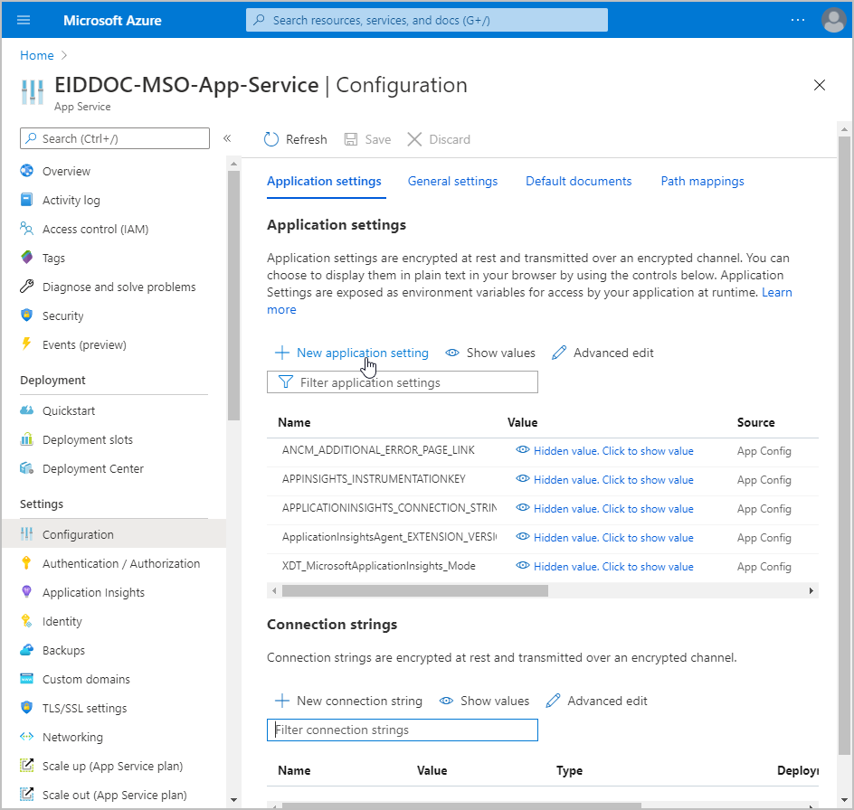 Back in the Application settings tab of the Configuration blade, click New Application setting.