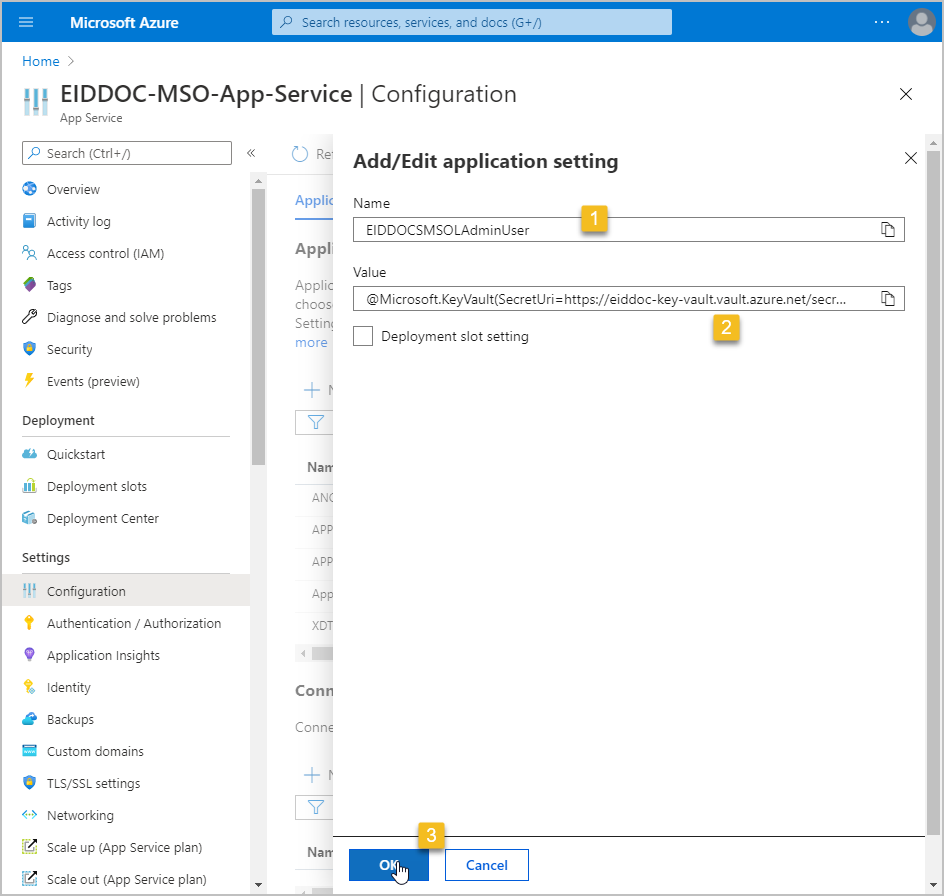- Value – Enter @Microsoft.KeyVault(SecretUri={The_Secret_Identifier_For_The_Second_Secret}), replacing {The_Secret_Identifier_For_The_Second_Secret} with the actual Secret Identifier for the secret.