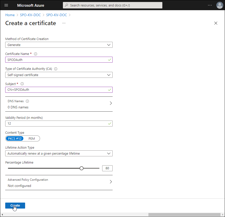 - Navigate to the Certificate page for the key vault and generate a self-signed certificate for it.