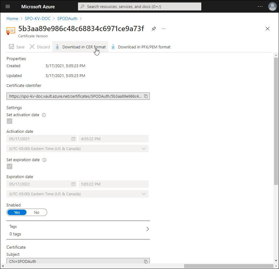 - Download the certificate in CER format. You will add this to the service principal you created with the Graph and SharePoint API permissions.