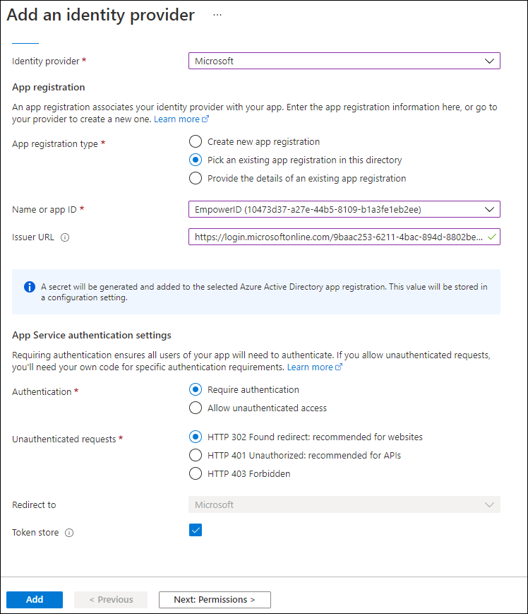 - Navigate to the Authentication blade for the app service and click Add identity provider.