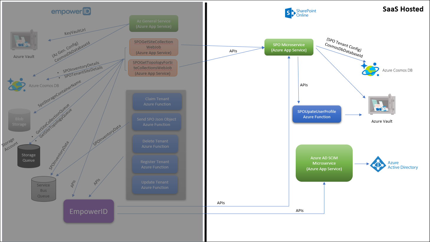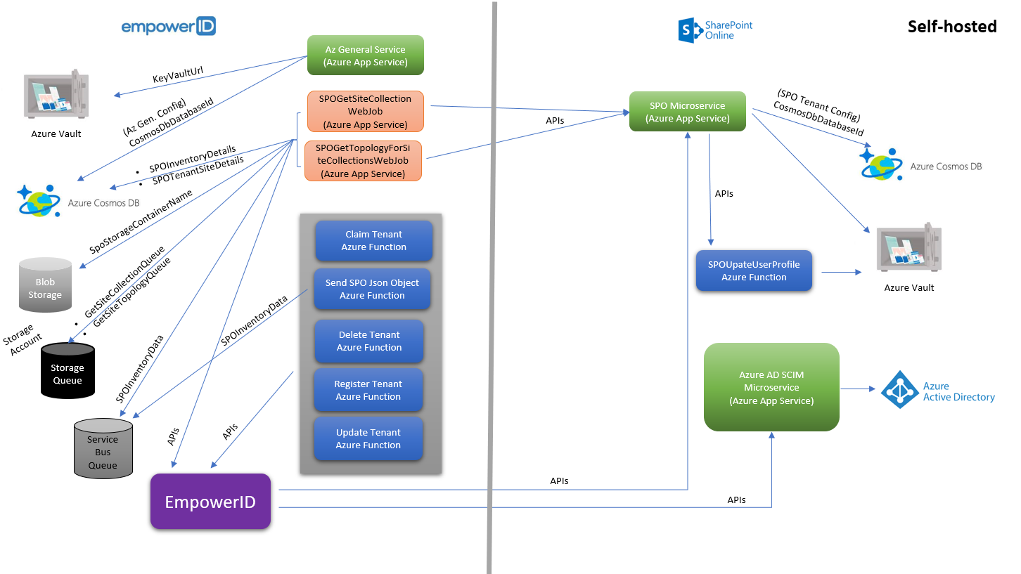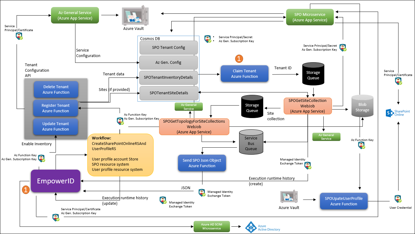 | SPO Functions Function App with Managed Identity | Function to register SharePoint tenants in Cosmos DB Function to update SharePoint tenants in Cosmos DB Function to delete SharePoint tenants in Cosmos DB Function to claim inventory for SharePoint tenants in Cosmos DB Function to process data in the service bus queue and pushes it to EmpowerID All functions retrieve the configuration data from AzGeneralService App Service |