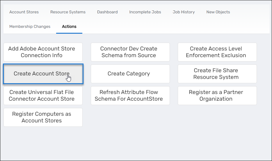 - On the Account Stores page, select the Actions tab and then click Create Account Store.