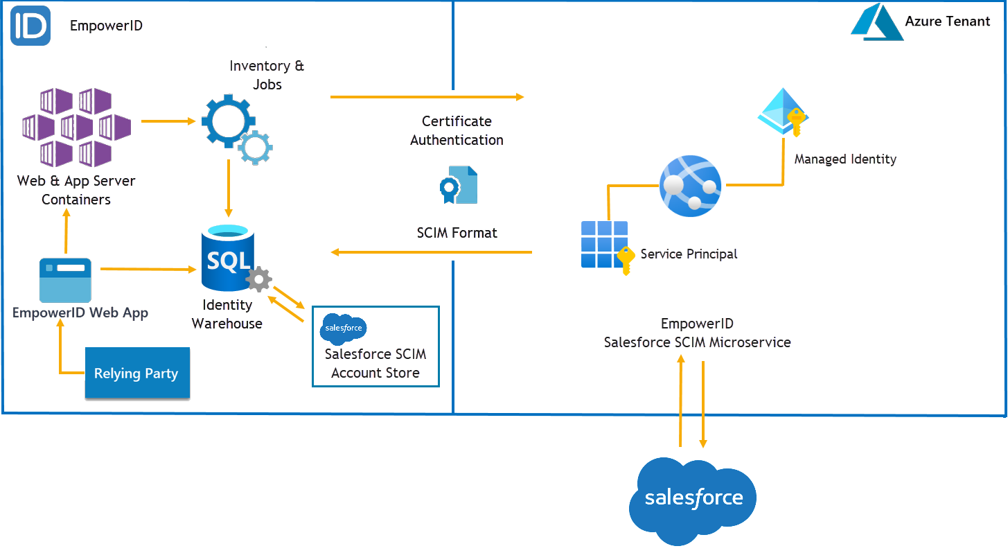 EmpowerID Salesforce connector is a bi-directional connector that communicates with the Salesforce SCIM microservice for inventory and write-back functionality of users, groups, group membership, and user licenses between EmpowerID and Salesforce via REST API calls to Salesforce. The Salesforce SCIM microservice is an EmpowerID microservice that you deploy to an Azure app service. The app service uses a system-assigned managed identity linked to an application you create in Azure AD for EmpowerID. The managed identity allows the microservice to access Azure AD-protected services without needing to supply credentials for authentication. The entire process uses secure client certificate authentication. The connector authenticates to the microservice using Azure Authentication. The request and response of the microservice are SCIM compliant.
